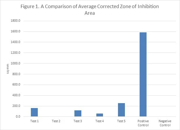 Figure 1. A comparison of the area of the corrected zone of inhibition of 5 novel antimicrobial materials compared to a predicate material positive control and a sham negative control.